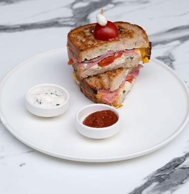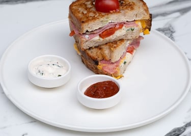Kızarmış ekşi mayalı ekmek , cheddar peyniri, roast beef füme et, mozarella peyniri, közlenmiş kapya biberi yanında peynir sos ve acuka ile