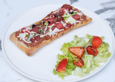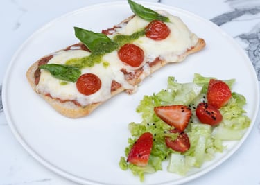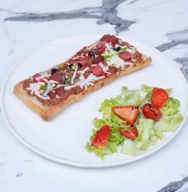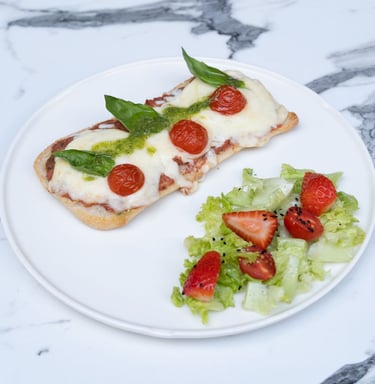 Pizza sos, suda mozarella, çeri domates, fesleğen, çilekli yeşil salata ile