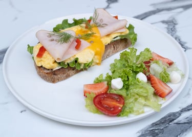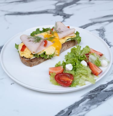 Ekşi mayalı ekmek, çırpılmış yumurta, hindi füme, Cheddar peyniri, kapya biber, çilekli yeşil salata ile