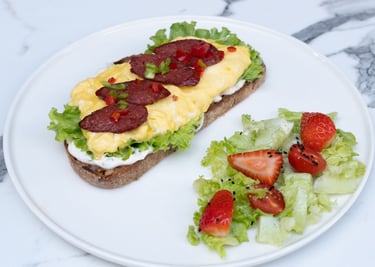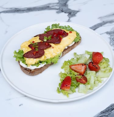 Ekşi mayalı ekmek, çırpılmış yumurta, taze baharatlı peynir sos, sucuk, kapya biber, çilekli yeşil salata ile