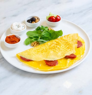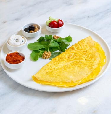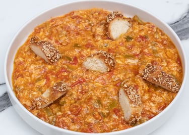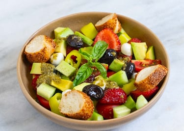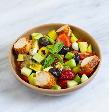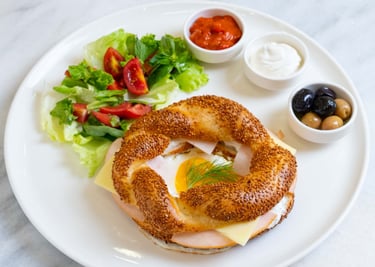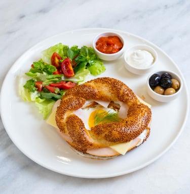Simit, çilek, çeri domates, salatalık, avokado, zeytin, mozarella buffalo top peynir, yeşil biber, fesleğen, pesto sos ve zeytinyağı ile servis edilir